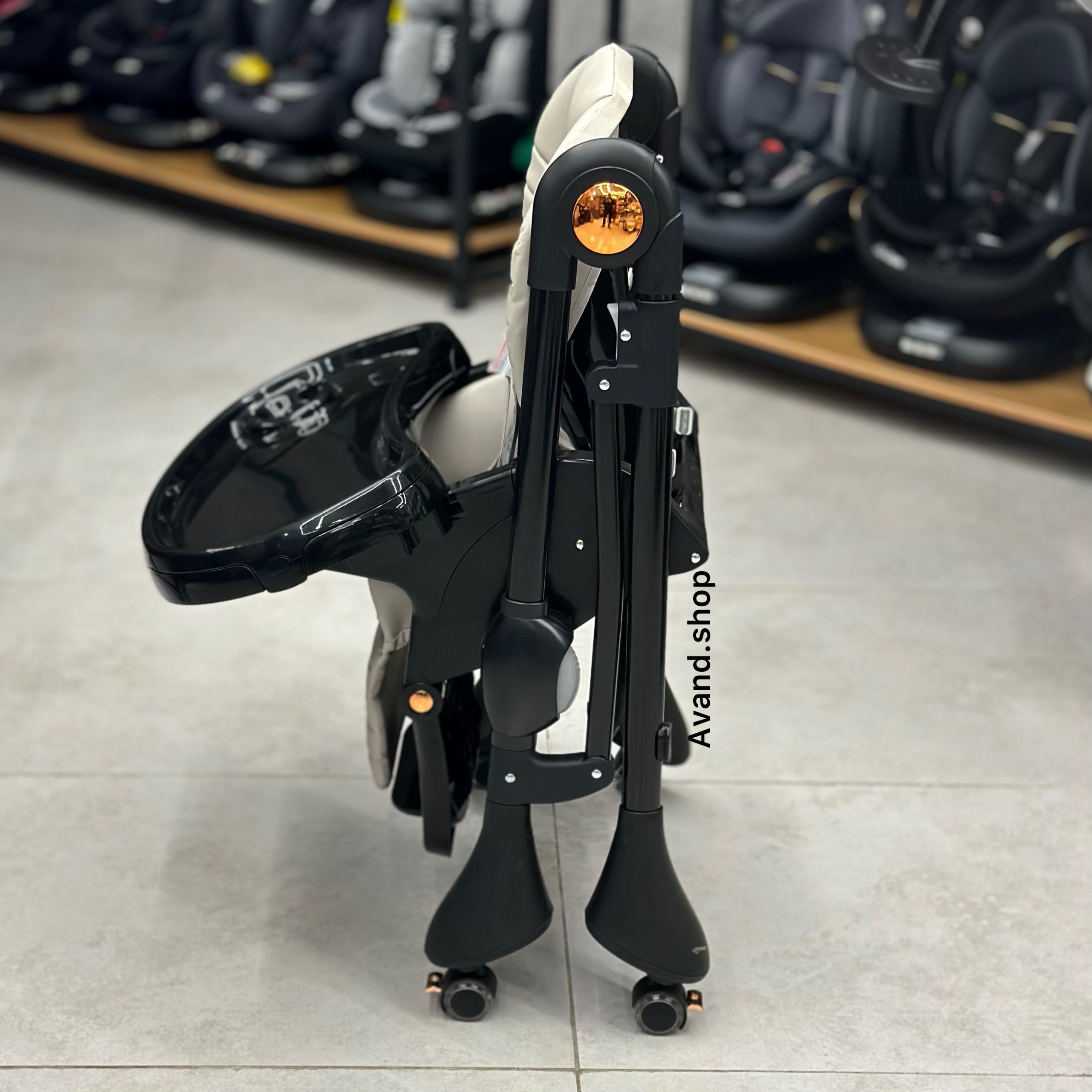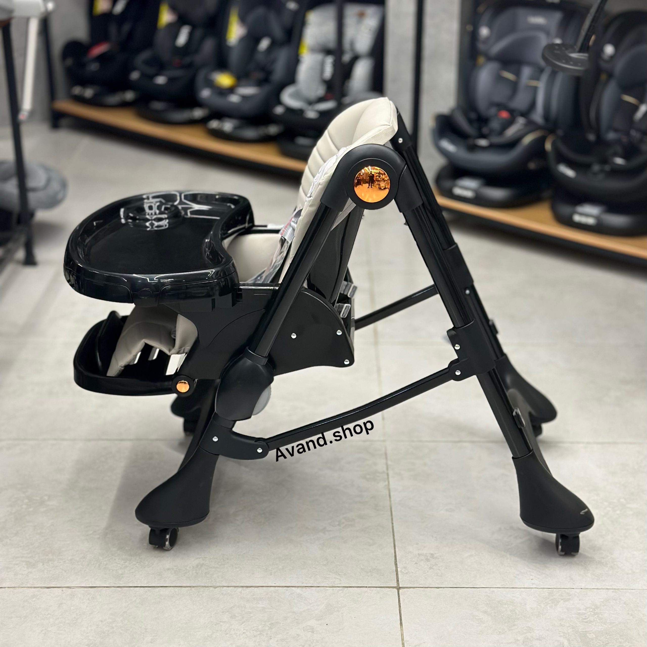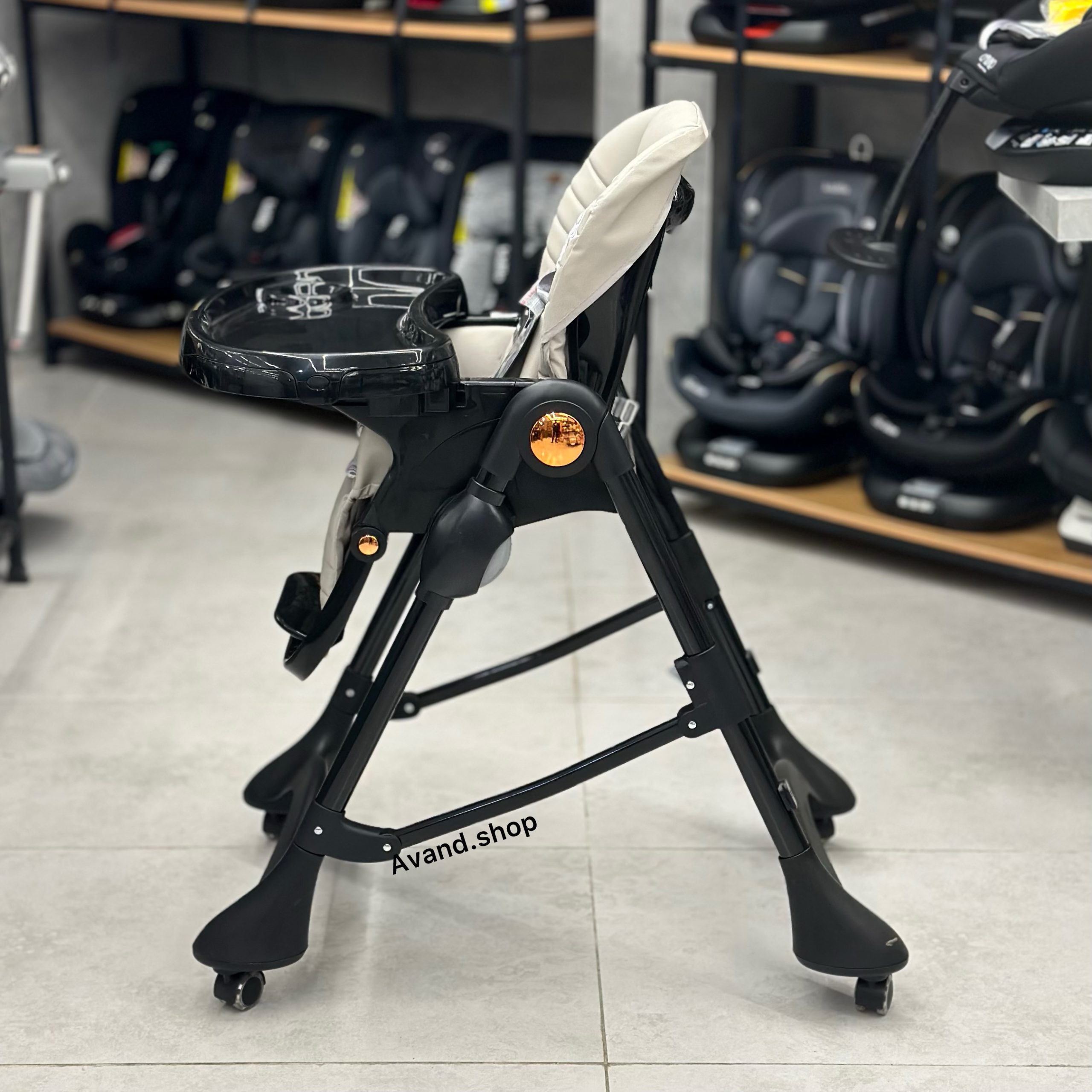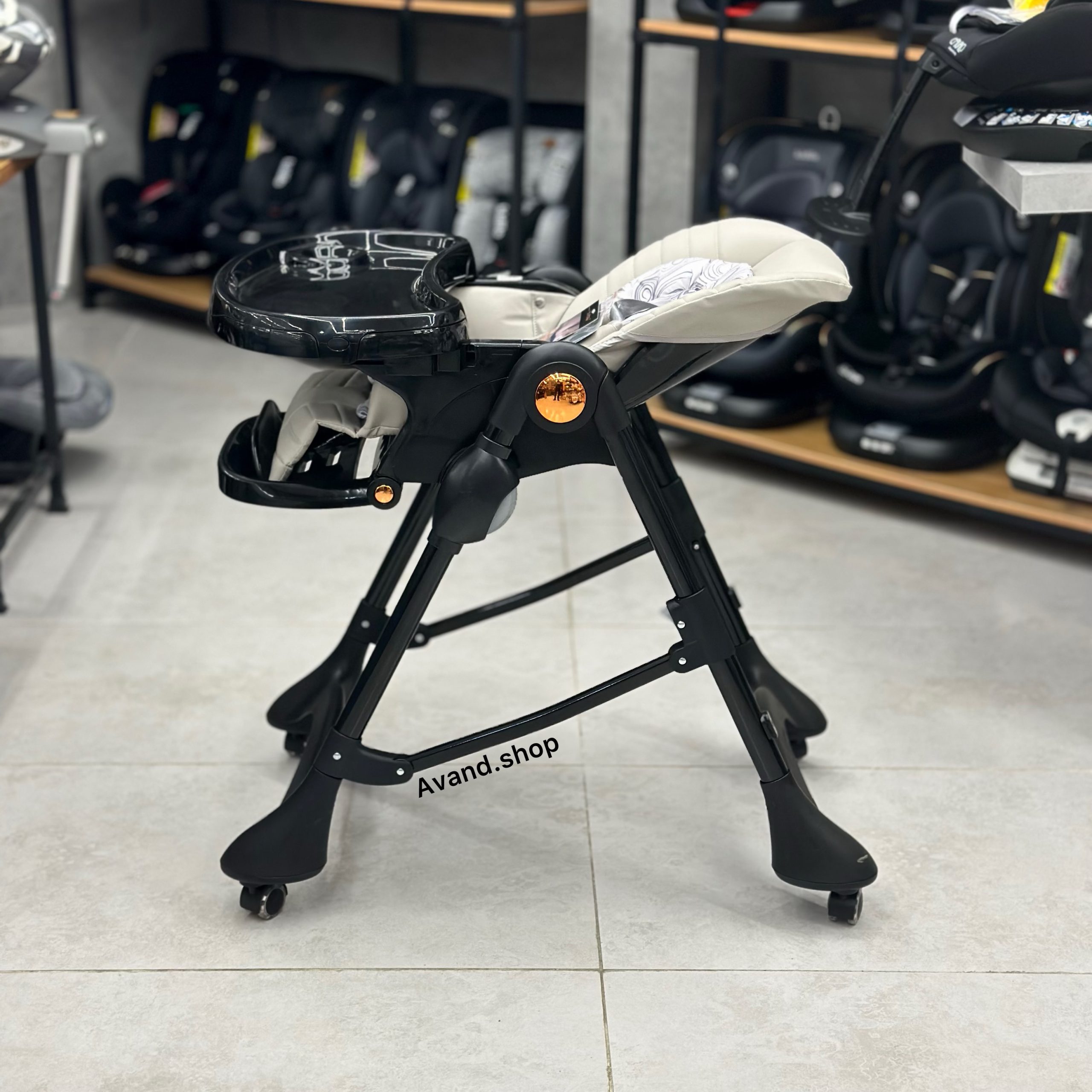این صندلی غذای کودک دارای تنظیم ارتفاع پایه و تکیه گاه پشتی است